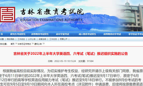 从吉林省教育考试院发布的通知《吉林省关于2022年上半年大学英语四、六考试(笔试)推迟组织实施的公告》可以知道,吉林省原定于6月11日举行的2022年上半年大学英语四、六考试(笔试)推迟至9月17日举行。