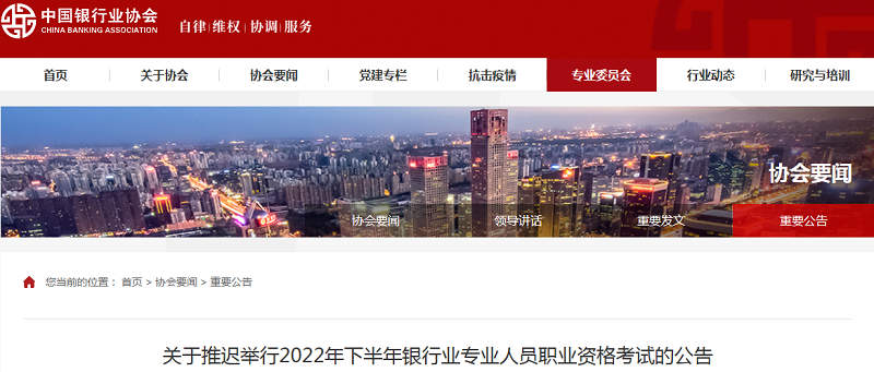 今天,中国银行业协会发布消息,鉴于近期疫情防控形势,为配合各地疫情防控政策,确保广大考生的身体健康,银行业专业人员职业资格考试办公室经过慎重研究,并报相关部委批准,决定将原定于2022年9月24、25日开展的银行业专业人员职业资格考试推迟举行。