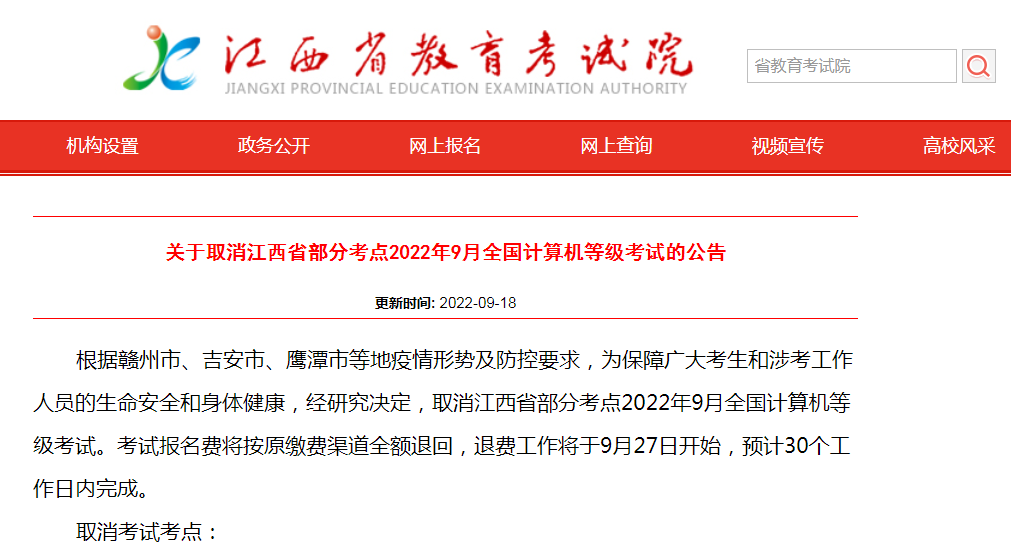 根据赣州市、吉安市、鹰潭市等地疫情形势及防控要求,为保障广大考生和涉考工作人员的生命安全和身体健康,经研究决定,取消江西省部分考点2022年9月全国计算机等级考试。考试报名费将按原缴费渠道全额退回,退费工作将于9月27日开始,预计30个工作日内完成。