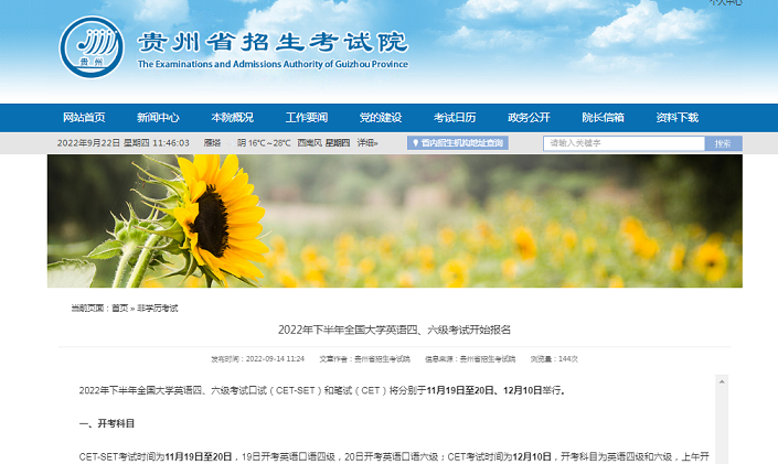 贵州省招生考试院发布的《2022年下半年全国大学英语四、六级考试开始报名》