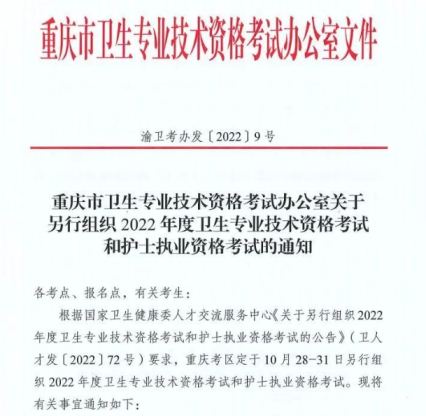 9月26日消息,重庆医药卫生人才网发布《重庆市卫生专业技术资格考试办公室关于另行组织2022年度卫生专业技术资格考试和护士执业资格考试的通知》,通知中明确重庆地区另行组织2022年卫生资格初级药士考试的准考证打印时间为10月24至31日,前期完成了报名及缴费工作的人员务必及时打印准考证。