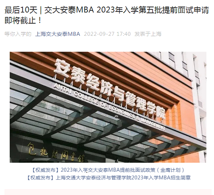 近日,上海交大安泰MBA发布了《最后10天 | 交大安泰MBA2023年入学第五批提前面试申请即将截止!》,通知里指出2023年上海交通大学安泰学院MBA项目第五批提前面试将于10月6日截止,有报考意向的考生请抓紧时间报名。