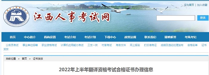 江西人事考试网发布《2022年上半年翻译资格考试合格证书办理信息》