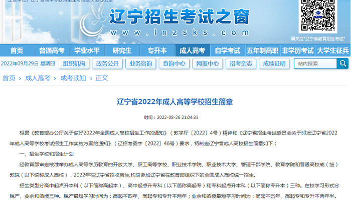 辽宁招生考试之窗发布的《辽宁省2022年成人高等学校招生简章》