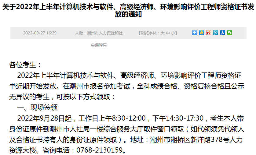 《关于2022年上半年计算机技术与软件、高级经济师、环境影响评价工程师资格证书发放的通知》已发布,根据通知得知,2022上半年广东潮州软考中级职称证书于9月28日已开始领取,考生可选择现场或邮寄领取!