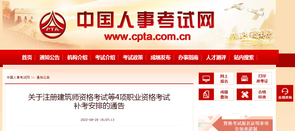 2022年9月29日,中国人事考试网发布《关于注册建筑师资格考试等4项职业资格考试补考安排的通告》,其中明确2022年一级注册建筑师资格考试暂停考试地区补考安排在12月10日、11日举行。
