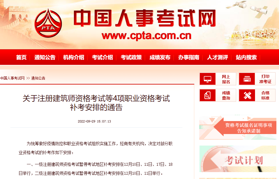 中国人事考试网发布的《关于注册建筑师资格考试等4项职业资格考试补考安排的通告》
