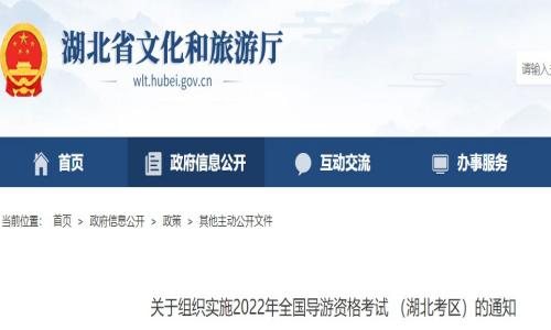 近期,湖北省文化和旅游厅发布《关于组织实施2022年全国导游资格考试 (湖北考区)的通知》,通知明确2022年湖北省导游证考试时间为11月26日,建议考生合理安排复习时间,按时参加考试,详情如下: