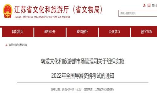 近期,江苏省文化和旅游厅发布《转发文化和旅游部市场管理司关于组织实施2022年全国导游资格考试的通知》,通知中明确了江苏省2022年导游资格证考试时间为11月26日,届时考生需要提前熟悉考场,按时参加考试,详情如下: