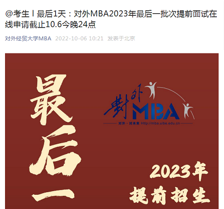 对外经贸大学MBA教育中心发布的《最后1天:对外MBA2023年最后一批次提前面试在线申请截止10.6今晚24点》