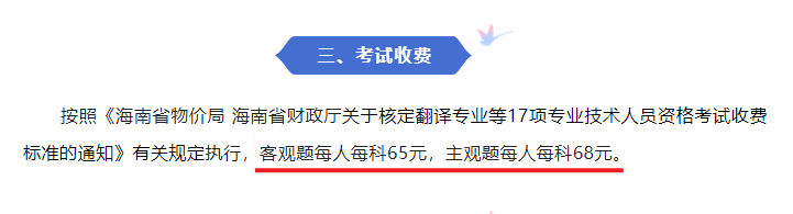 按照《海南省物价局 海南省财政厅关于核定翻译专业等17项专业技术人员资格考试收费标准的通知》有关规定执行,客观题每人每科65元,主观题每人每科68元。