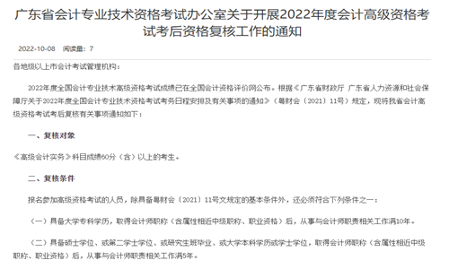 近日,广东省会计专业技术资格考试办公室发布关于开展2022年度会计高级资格考试考后资格复核工作的通知,指出广东省高级会计师考后资格复核10月13日至21日进行,具体详情如下: