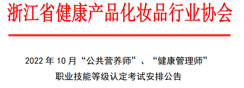 近日,本站编辑从浙江省健康产品化妆品行业协会官网发布的《2022年10月“公共营养师”、“健康管理师”职业技能等级认定考试安排