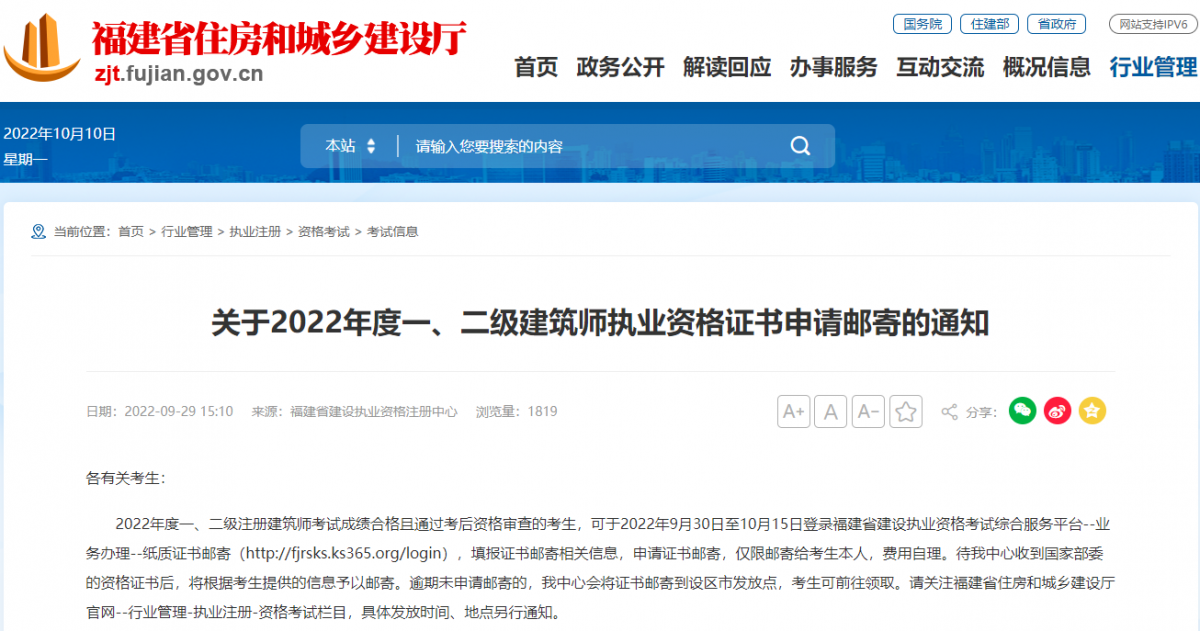 福建省住建厅发布的2022年二级建筑师证书领取通知
