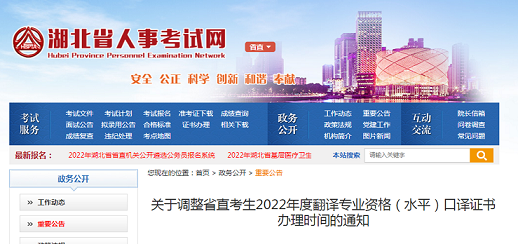 湖北省人事考试网《关于调整省直考生2022年度翻译专业资格(水平)口译证书办理时间的通知》