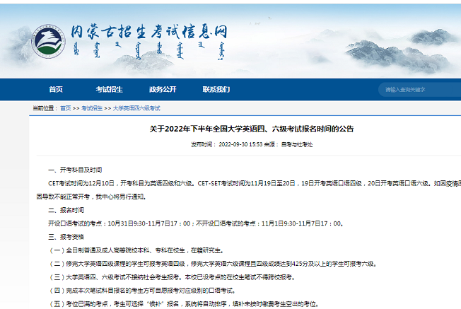 内蒙古招生考试信息网发布了《关于2022年下半年全国大学英语四、六级考试报名时间的公告》