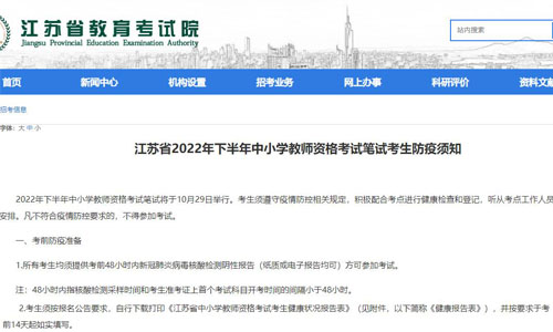 江苏省教育考试院《江苏省2022年下半年中小学教师资格考试笔试考生防疫须知》