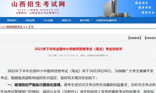 山西招生考试网《2022年下半年全国中小学教师资格考试(笔试)考生告知书》