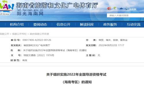近期,海南省旅游和文化广电体育厅官网发布《关于组织实施2022年全国导游资格考试(海南考区)的通知》。通知中明确2022年海南省导游资格考试时间为11月26日,提醒考生合理安排复习时间,按时参加考试。详情如下: