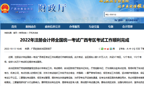 2022年10月13日,广西壮族自治区财政厅发布了《2022年注册会计师全国统一考试广西考区考试工作顺利完成》,文章中提到2022年广西全区报名人数1.97万人次,共设5个考区。通知中与考试人数相关内容如下: