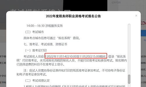 考试报名人员应于2022年11月14日10:00至11月20日15:00期间,登录“报名系统”打印准考证。未完成报名流程的报名人员,不能打印准考证和参加考试。报名期内已选择退费的科目不在准考证上显示。
