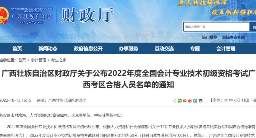 10月13日,广西壮族自治区财政厅发布《关于公布2022年度全国会计专业技术初级资格考试广西考区合格人员名单的通知》明确了2022年度会计专业技术初级资格考试各科目的合格标准均为60分(各科目试卷满分均为100分)。据统计,广西达到全国会计专业技术初级资格考试成绩合格标准的人数为21057人。通知中与合格人数有关内容如下