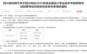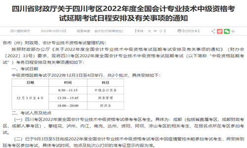 10月12日四川省财政厅发布了“关于四川考区2022年度全国会计专业技术中级资格考试延期考试日程安排及有关事项的通知”表明四川延期地区2022年考试在12月3日至4日举行。