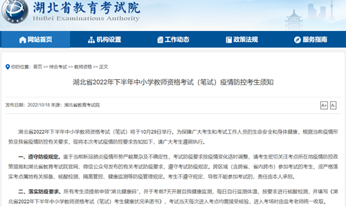 10月18日,湖北省教育考试院发布了《湖北省2022年下半年中小学教师资格考试(笔试)疫情防控考生须知》,明确了湖北省2022年下半年教师资格证笔试所有考生须提前申领“湖北健康码”,并于考前7天开展自我健康监测,每日自行监测体温,按要求进行核酸检测。