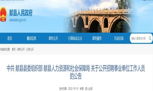 10月19日献县人民政府官网发布《中共 献县县委组织部 献县人力资源和社会保障局 关于公开招聘事业单位工作人员的公告》,其中事业单位招聘中包含教师岗位,报名时间为10月28日。详情如下: