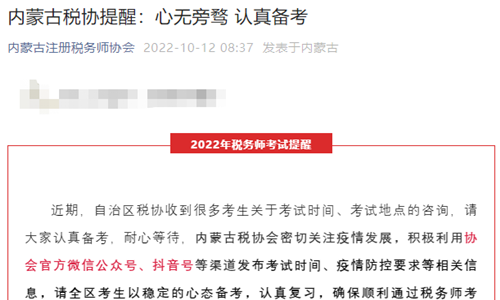 从内蒙古官方消息来看,目前还未公布任何延考的相关通知,而且,官方也说了,希望学员以稳定的心态备考,认真复习,确保顺利通过税务师考试。