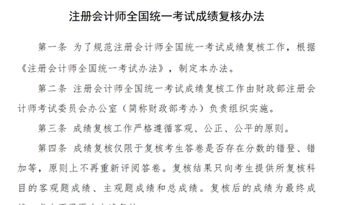 近日,中国注册会计师协会发布了《注册会计师全国统一考试成绩复核办法》,内容中提到需要对考试成绩复核的考生,可在成绩发布后第5个工作日起的10个工作日内,通过网报系统,提出复核申请。对成绩有异议的考生,可以按要求提出申请。文件中与成绩复核相关内容如下:
