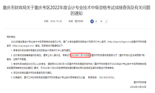 2022年度全国会计专业技术中级资格考试成绩已公布。请广大考生登录财政部会计财务评价中心官网(http://kzp.mof.gov.cn/)或重庆市财政局官网(http://czj.cq.gov.cn/)查询。现就有关问题通知如下: