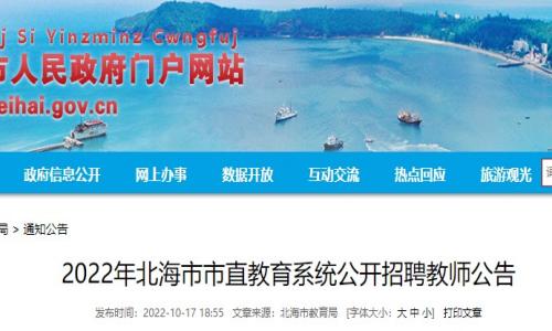 10月17日,北海市人民政府门户网站发布《2022年北海市市直教育系统公开招聘教师公告》,明确报名时间为10月20日至28日,提醒考生按时报名。