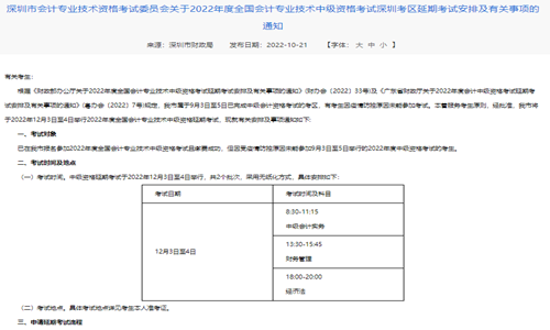 近日,本站编辑根据深圳市财政厅发布的“关于2022年度全国会计专业技术中级资格考试深圳考区延期考试安排及有关事项的通知”获知深圳中会延考安排在12月3日至4日举行,考生须在10月24日至11月6日期间申请参加。