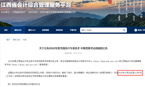 近日,本站编辑根据江西省财政厅发布的“关于公布2022年度全国会计专业技术 中级资格考试成绩的公告”获知江西中会成绩公布,考生如果对本人成绩实有疑义,可在2022年10月24日至11月7日期间申请复核。