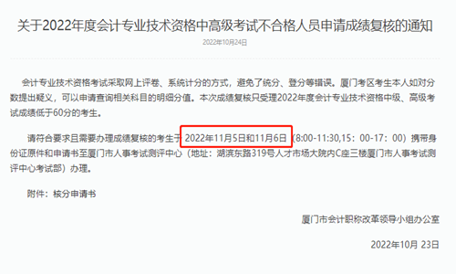 近日,本站编辑根据厦门市财政局发布的“关于2022年度会计专业技术资格中高级考试不合格人员申请成绩复核的通知”获知2022年高级会计师厦门考生成绩复核时间为11月5日和11月6日。