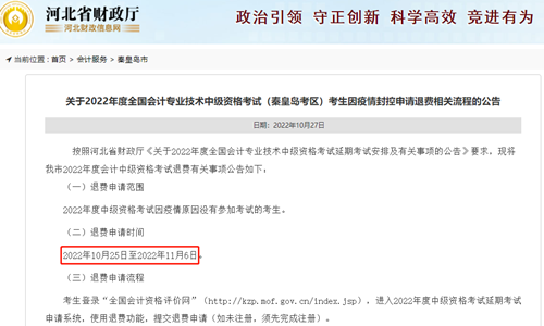 近日,本站编辑根据河北省财政厅发布的“关于2022年度全国会计专业技术中级资格考试(秦皇岛考区)考生因疫情封控申请退费相关流程的公告”获悉秦皇岛不组织延期考试,退费申请时间为10月25日至2022年11月6日。
