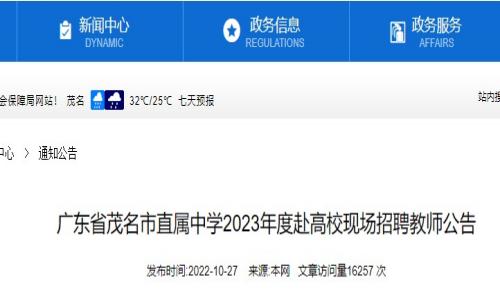 近日,茂名市人力资源和社会保障局发布《广东省茂名市直属中学2023年度赴高校现场招聘教师公告》,明确报名时间为2022年11月19日 - 2022年11月28日,提醒考生按时报名。