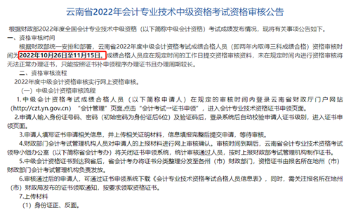 近日,本站编辑根据云南省财政厅发布的“云南省2022年会计专业技术中级资格考试资格审核公告”获知云南2022年中级会计职称考后资格审核10月26日至11月15日进行。
