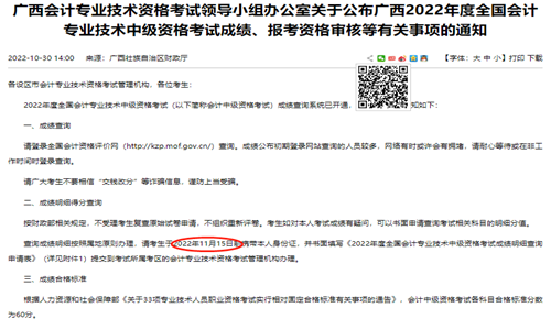 近日本站编辑根据广西省财政厅发布的“广西会计专业技术资格考试领导小组办公室关于公布广西2022年度全国会计专业技术中级资格考试成绩、报考资格审核等有关事项的通知”知广西中级会计师成绩明细得分查询为11月15日前。
