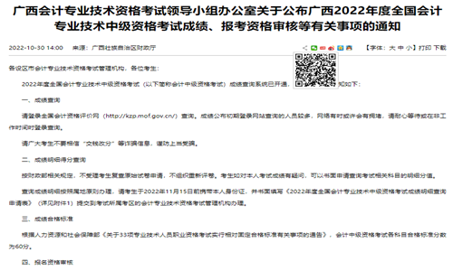 近日本站编辑根据广西省财政厅发布的“广西会计专业技术资格考试领导小组办公室关于公布广西2022年度全国会计专业技术中级资格考试成绩、报考资格审核等有关事项的通知”知广西中级会计师资格审核11月15日前进行。