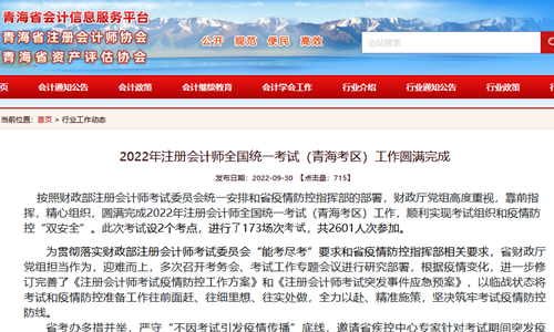 近日,青海省注册会计师协会发布了《2022年注册会计师全国统一考试(青海考区)工作圆满完成》,其中提到此次考试设2个考点,进行了173场次考试,共2601人次参加。