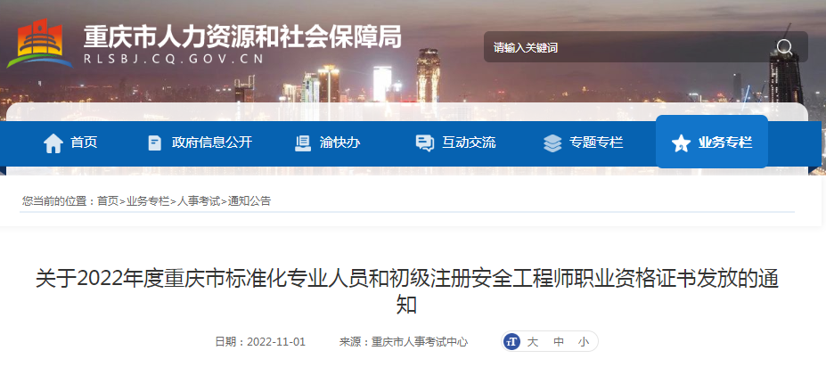 11月1日重庆市人事考试中心发布了《关于2022年度重庆市标准化专业人员和初级注册安全工程师职业资格证书发放的通知》,通知中提到2022年重庆初级注册安全工程师证书领取时间:2022年11月11日-12月2日(工作日)上午9:00-12:00,下午14:00-18:00。相关原文如下: