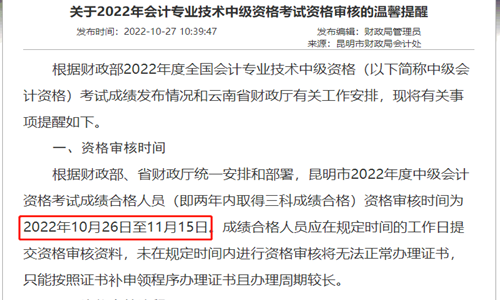 近日,本站编辑根据昆明市财政局发布的“关于2022年会计专业技术中级资格考试资格审核的温馨提醒”获知云南昆明2022年中级会计资格审核时间为2022年10月26日至11月15日。