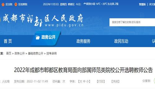 近日,成都市郫都区人民政府官网发布《2022年成都市郫都区教育局面向部属师范类院校公开选聘教师公告》,明确报名时间为 2022年11月12日 08:30 - 2022年11月12日 12:00,提醒考生按时报名。