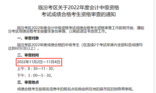近日本站编辑根据山西会计之星发布的“临汾考区关于2022年度会计中级资格考试成绩合格考生资格审查的通知”获悉山西临汾中级会计师考试资格审核11月2日至4日举行。