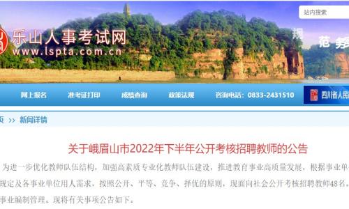 近日,乐山人事考试网发布《关于峨眉山市2022年下半年公开考核招聘教师的公告》,明确报名时间为2022年11月9日至11月11日,11月14日至11月18日,提醒考生按时报名。