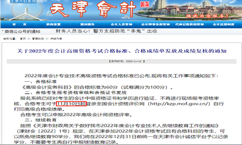 近日,本站编辑根据天津会计信息网发布的“关于2022年度会计高级资格考试合格标准、合格成绩单发放及成绩复核的通知”获悉2022年天津高级会计师成绩复核时间2022年11月14日零时至2022年11月18日24时。