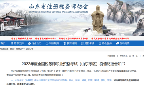 2022年11月10日,山东注册税务师协会发布了《2022年度全国税务师职业资格考试(山东考区)疫情防控告知书》,其中提到山东考区(除青岛)参加11月19日至20日考试的城市有:烟台、潍坊、威海、日照、聊城、滨州、菏泽。省内其他城市受疫情等影响延期开考。