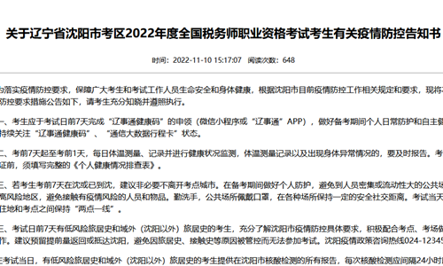 2022年11月10日,辽宁注册税务师协会发布了《关于辽宁省沈阳市考区2022年度全国税务师职业资格考试考生有关疫情防控告知书》,在考试当日,有低风险旅居史和域外(沈阳以外)旅居史的考生提供在沈阳市核酸检测的所有报告,每次核酸检测应间隔24小时以上。